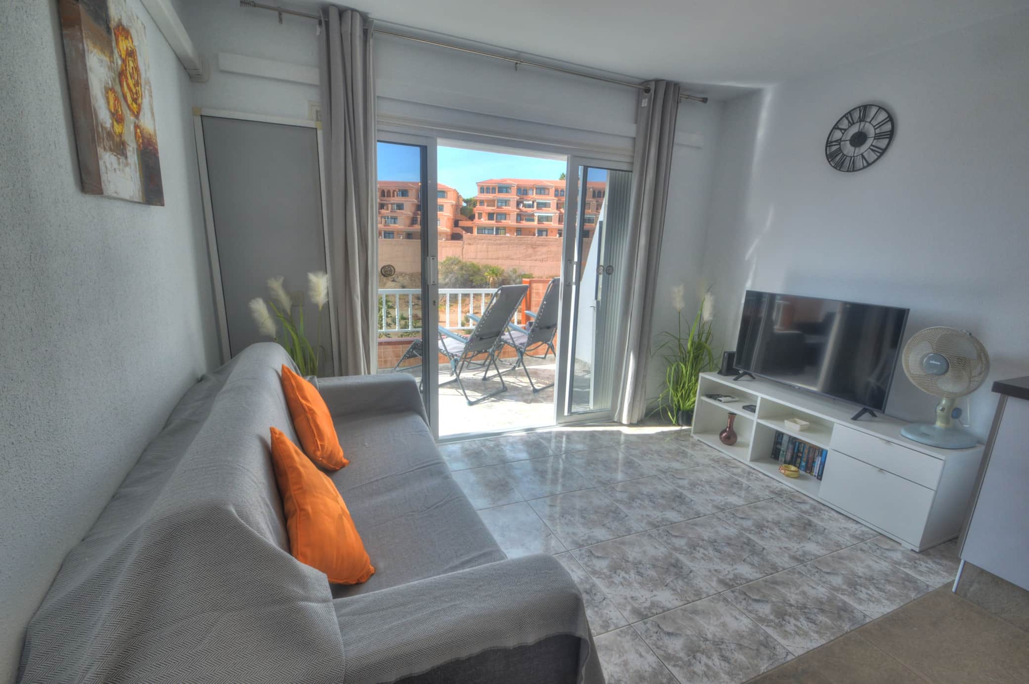 L'appartamento si trova al primo piano, accessibile tramite una rampa di scale dal vialetto interno del complesso Sunset View. Dispone di una zona giorno con accesso a un ampio balcone, arredato con due lettini reclinabili, un'area con poltrone e un tavolino, e un pratico tendone per l'ombra durante le ore più calde. L'appartamento include una camera da letto con due letti singoli e TV, un divano letto nel soggiorno e un bagno con doccia a filo pavimento.